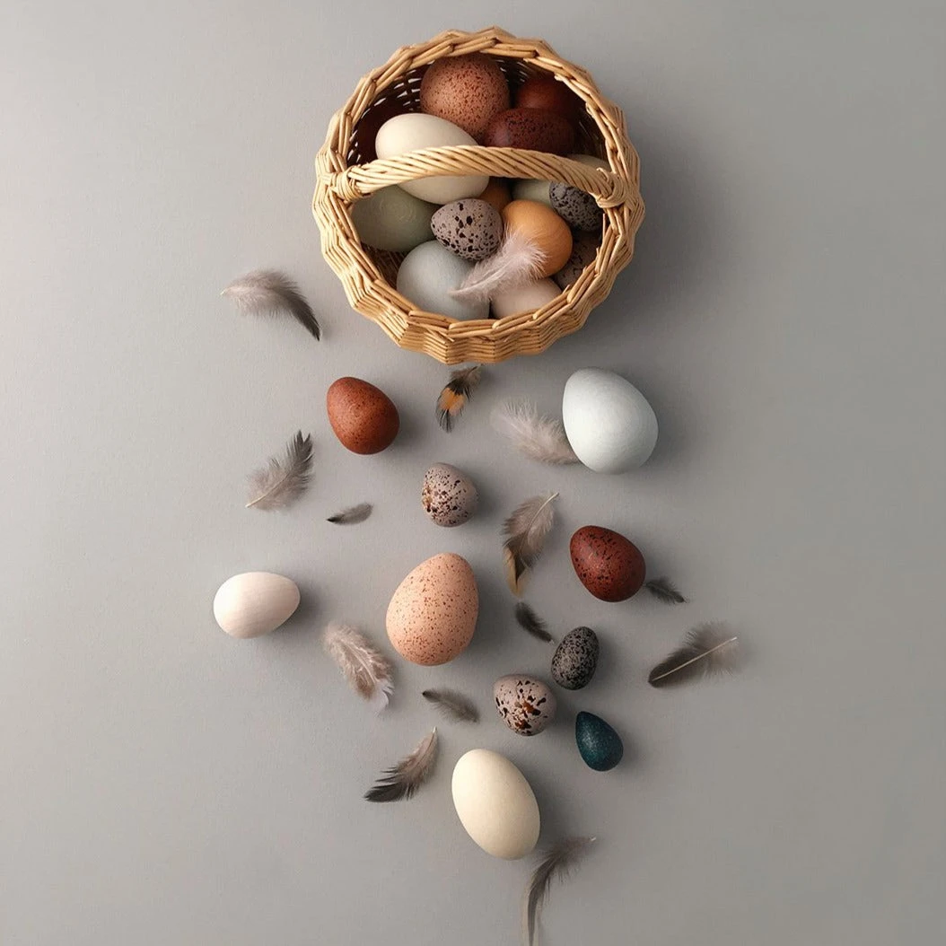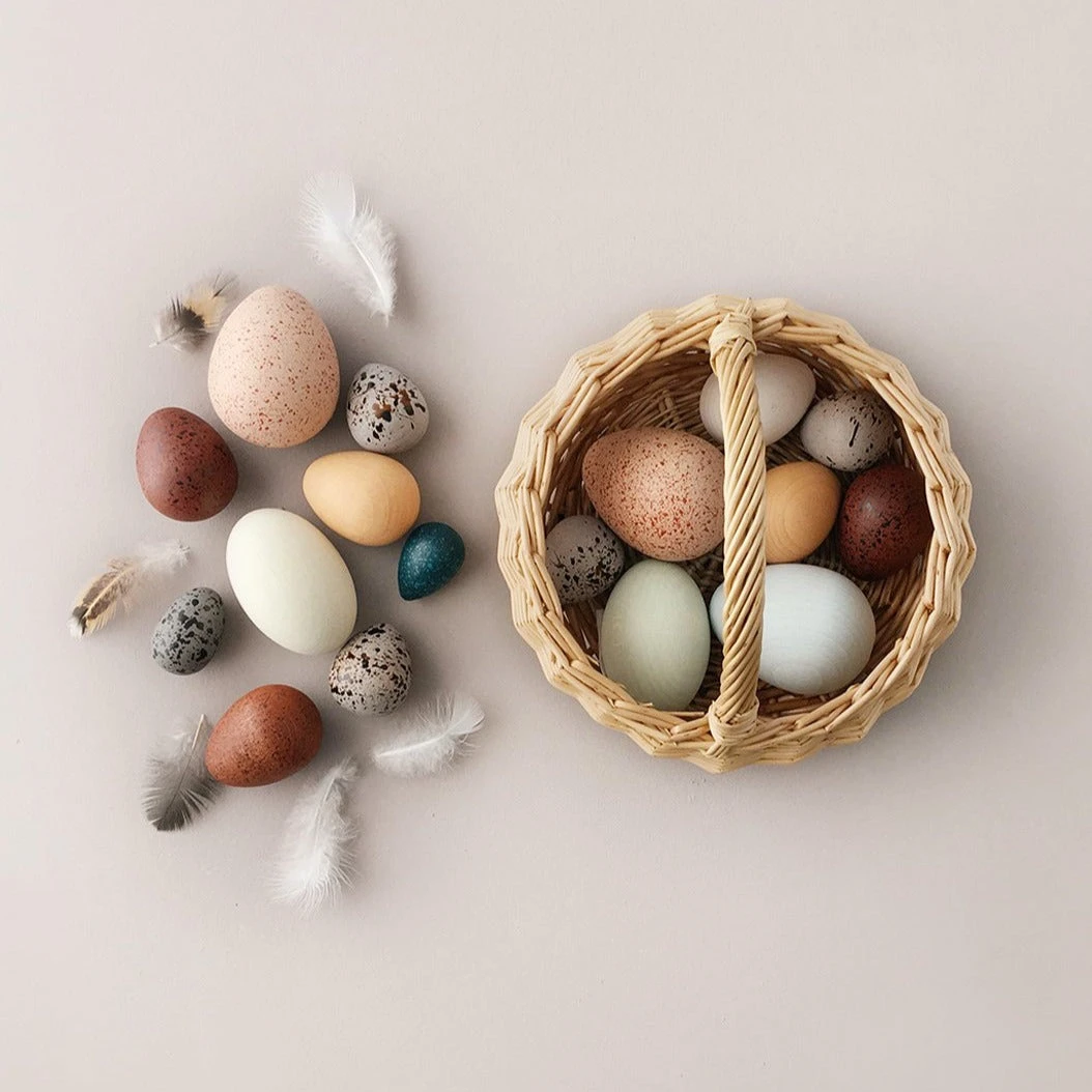 This beautiful wooden toy set is perfect for little hands to hold, roll, count and put in and out of the basket. Sort them by sizes and observe the lovely colours and speckles.