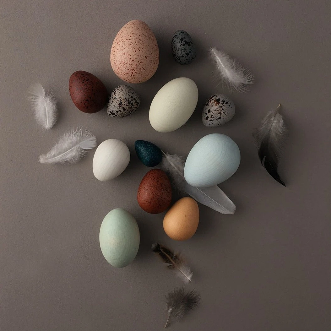 12 wooden eggs of different sizes are lathe turned in solid beech wood and beautifully hand painted in Germany.