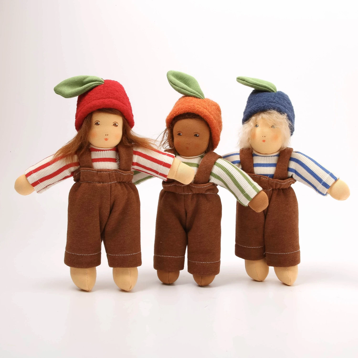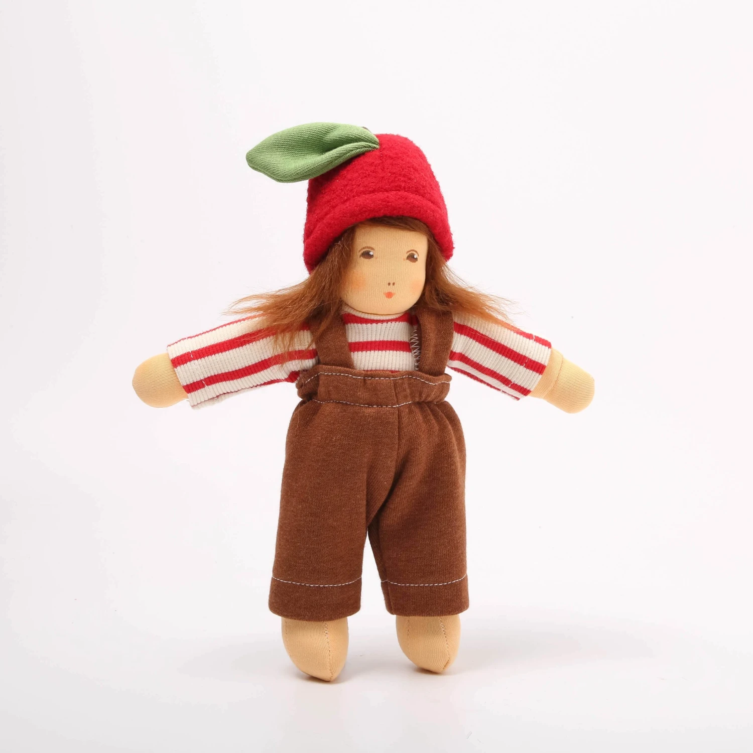 Meet Anna, a delightful Apple Child Waldorf doll by Nanchen Natur, handmade in the German countryside. Crafted from organic cotton and pure new wool, she is soft and huggable, dressed in brown dungarees, a red striped top, and a bright red cap — the perfect little woodland friend.