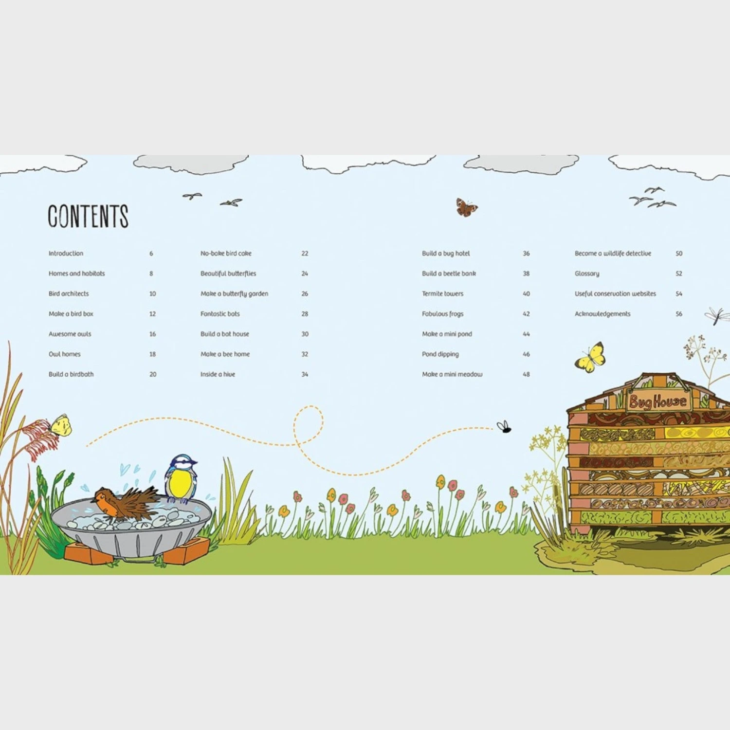 Each project includes easy-to-follow illustrated step-by-step instructions along with detailed material and tool lists. Activities include: Mini Wildlife Garden, Bug Hotel, Beetle Bank, Bat House, Nest Boxes, Bird and Butterfly Feeders and more.