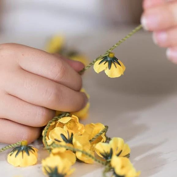 Contains 12 small silk petal buttercups with fluffy middles andĀ soft yarn stems. Full length when joined is 50cm. Includes ribbon for ending the designs and instructions.