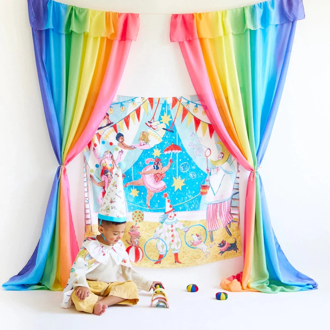 This Circus Hat is made of 100% pure mulberry silk, perfect for make believe as a jester, ballerina, magician, and so much more! In our limited edition Circus print featuring illustrations by Phoebe Wahl, this sustainably made dress-up piece brings magic to every dress-up box.