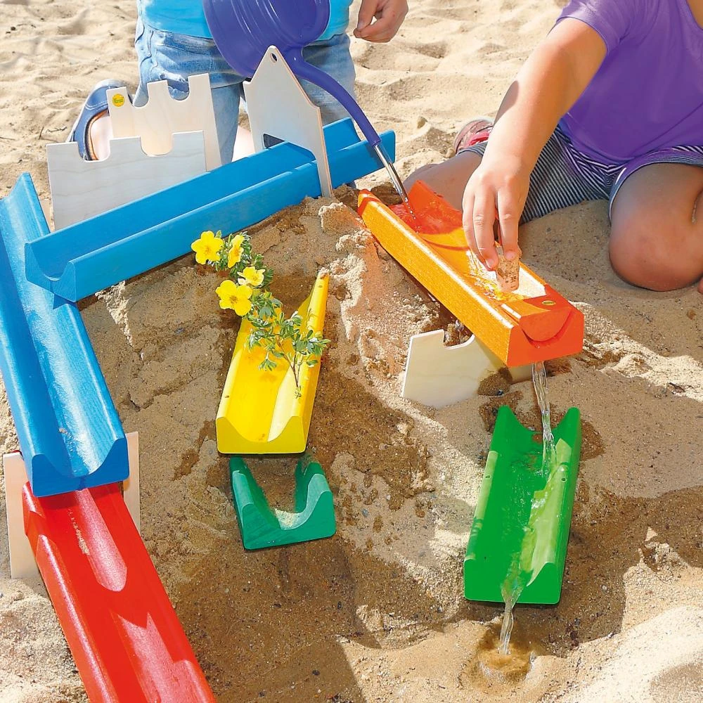 Children can learn some interesting physical science while having fun with this versatile set. The course can be set up inside or out, even in the sandpit! Water or marbles are then set off down the course, showing how well it has been designed. A small dam brings the marble to a stop, or causes the water to spill over the side, while a hole can make the water or marble suddenly drop down to a lower level. Sticks or flowers can be inserted in the holes at the sides for decoration or design purposes.