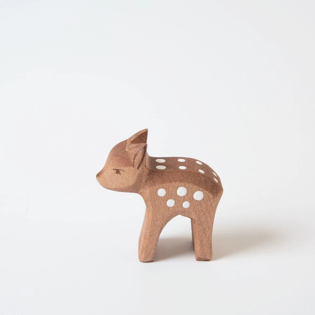 Handcrafted wooden fawn with small head held high – part of the Ostheimer woodland animals collection.