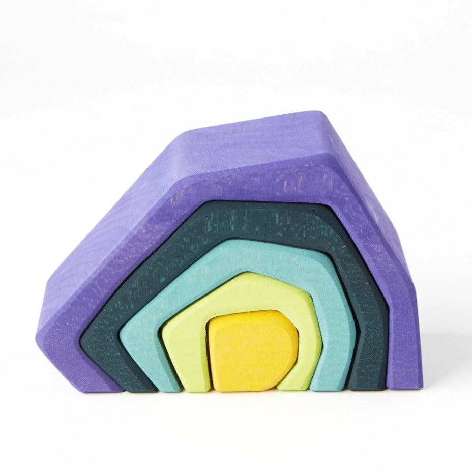 Grimm’s wooden puzzle in shades of yellow, green, turquoise, blue and purple.