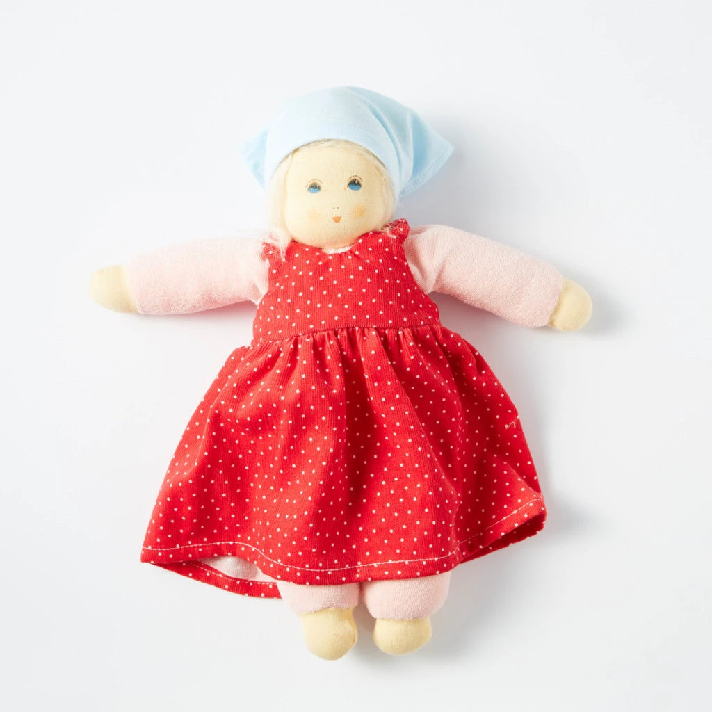 This beautiful and cuddly organic cotton doll has been lovingly hand made using the best natural materials. Each dolls face is painted by hand to give it its own personality and uniqueness. Her hair is soft and silky and she comes dressed in a blue cotton headscarf and red dress that are both removable. Your child will cherish and love this adorable doll for years to come. Completely safe and toxin free.Ā