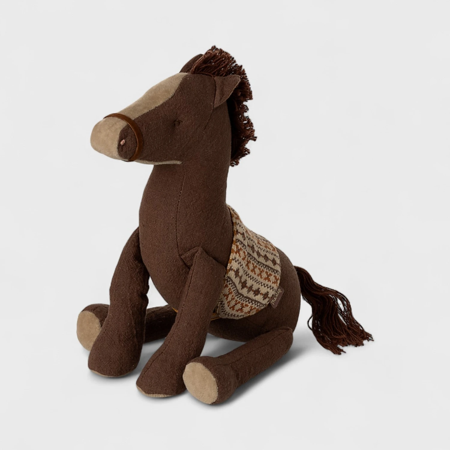This sweet brown pony is crafted from a soft cotton-linen blend, with a cotton string mane and tail. A cosy knitted saddle adds comfort for every adventure.