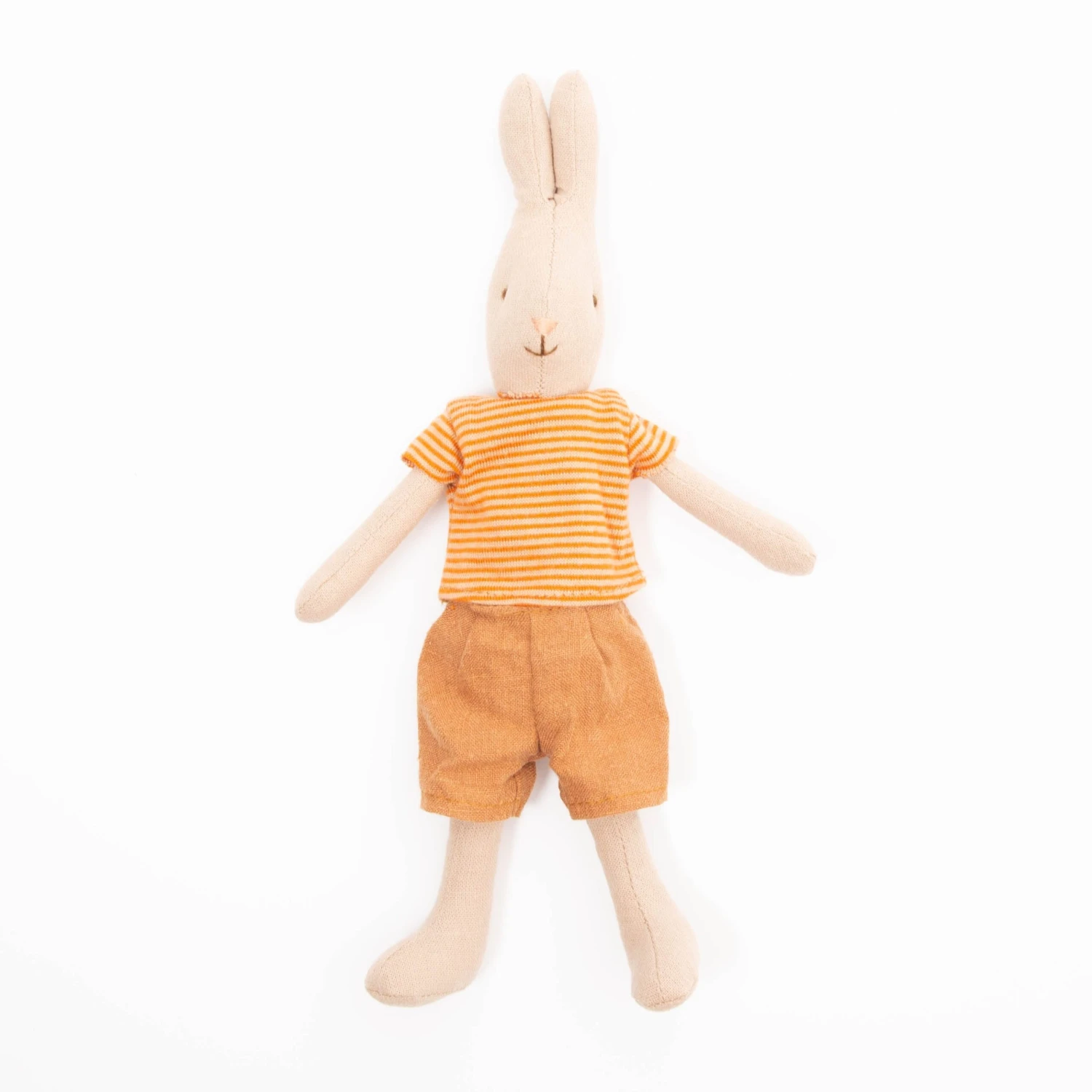 Maileg’s Rabbit collection is made of soft natural linen cotton fabric, which gives these beautiful soft toys a lovely hand crafted look. This beautiful rabbit is dressed in a gorgeous orange and soft yellow striped t-shirt with brown shorts to match.