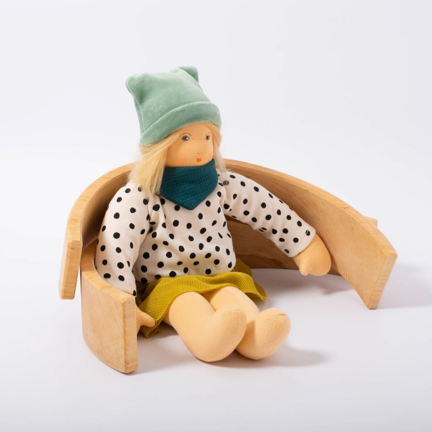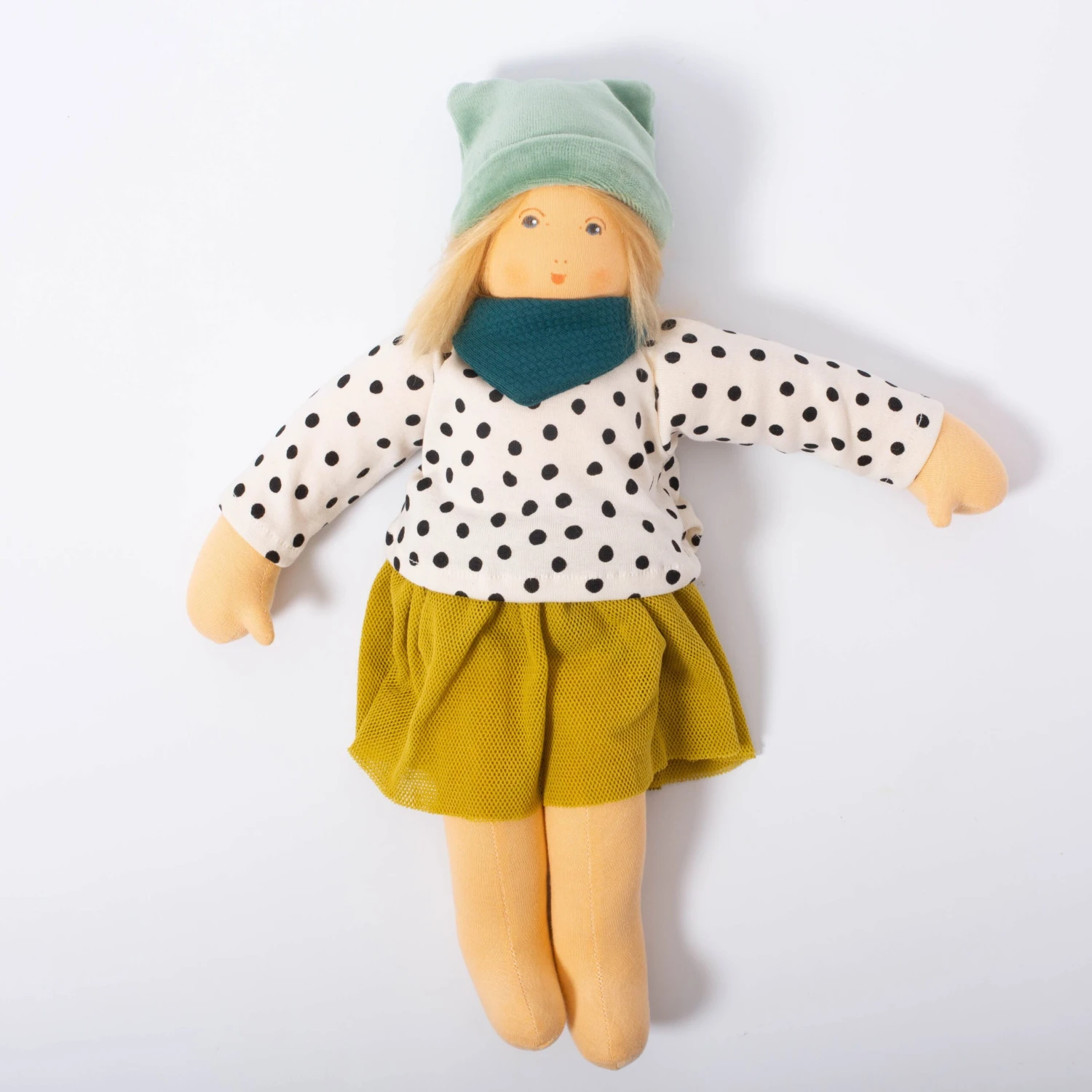 Lovingly hand-made by a small team in Germany, each doll’s face is painted with a unique, sweet but simple expression, encouraging a child’s imagination and creative play. The hair, made from high quality mohair, is soft and silky and easy to style, and can be brushed! Includes beautiful mesh skirt spotty jersey, scarf and hat. All clothing can be removed.