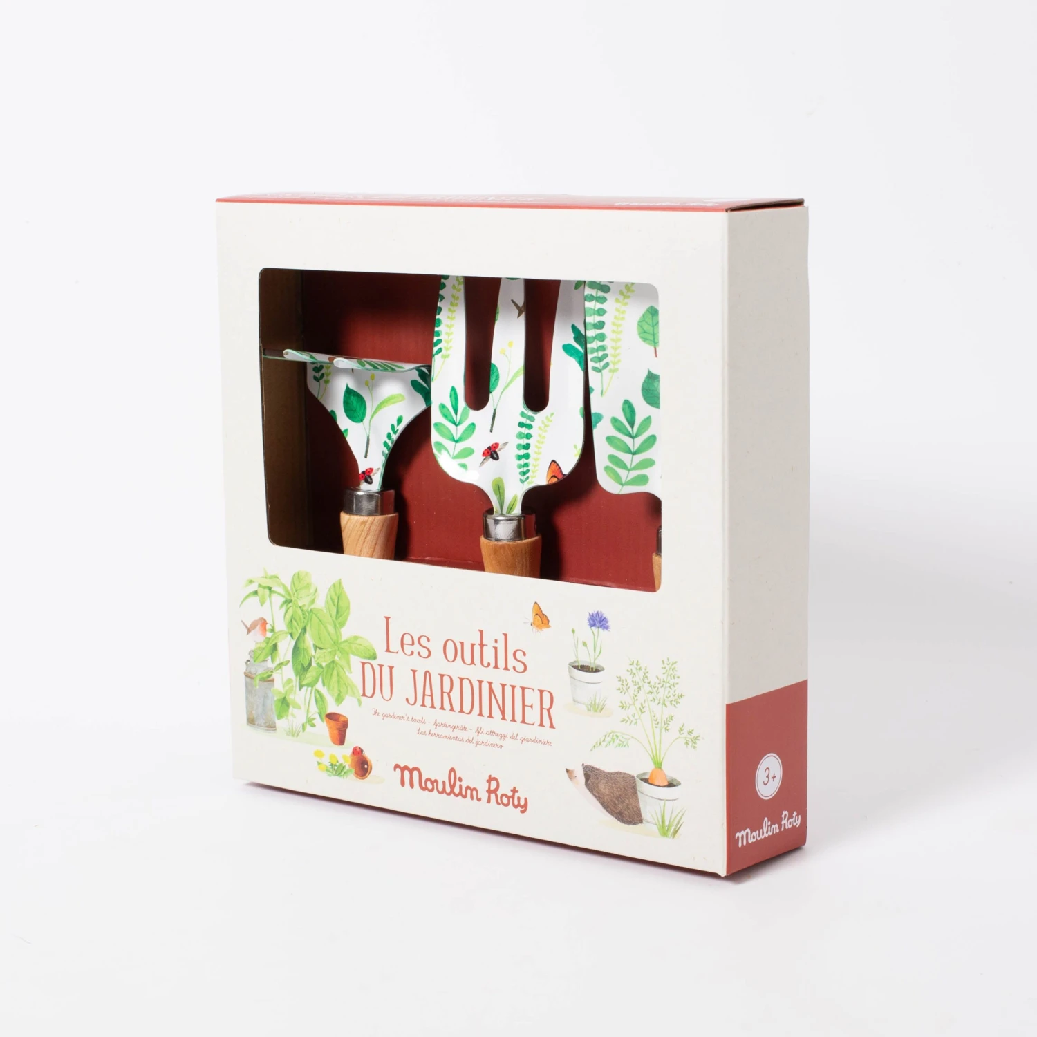 Set of 3 beautifully illustrated garden tools designed for little hands, each with a sturdy wooden handle.