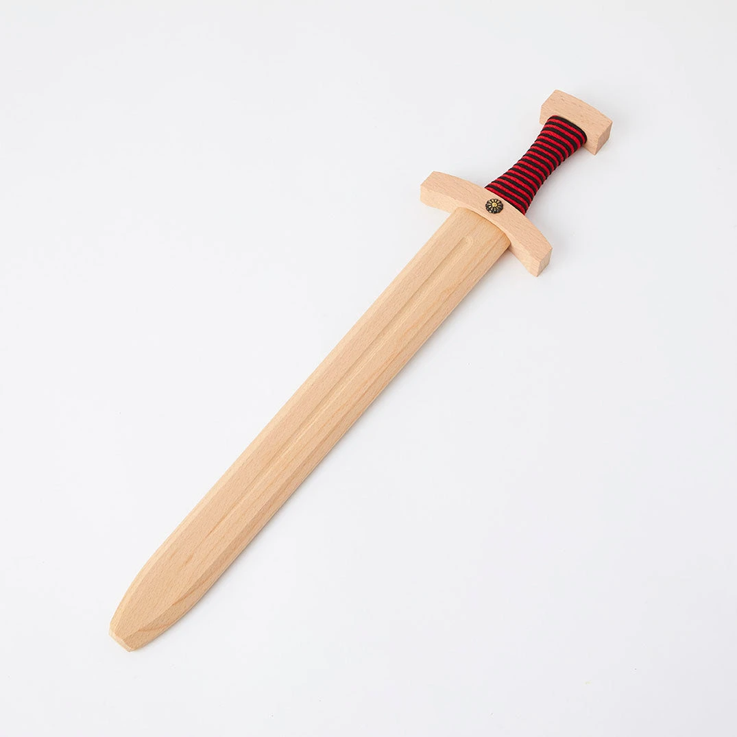 Going on a dangerous adventure exploring magical lands, full of fire breathing dragons and mythical beasts? Your little knight will need a trusty sword. This gorgeous handcrafted sword by Vah is made from solid wood with a red and black handle. Encourages imaginative play.