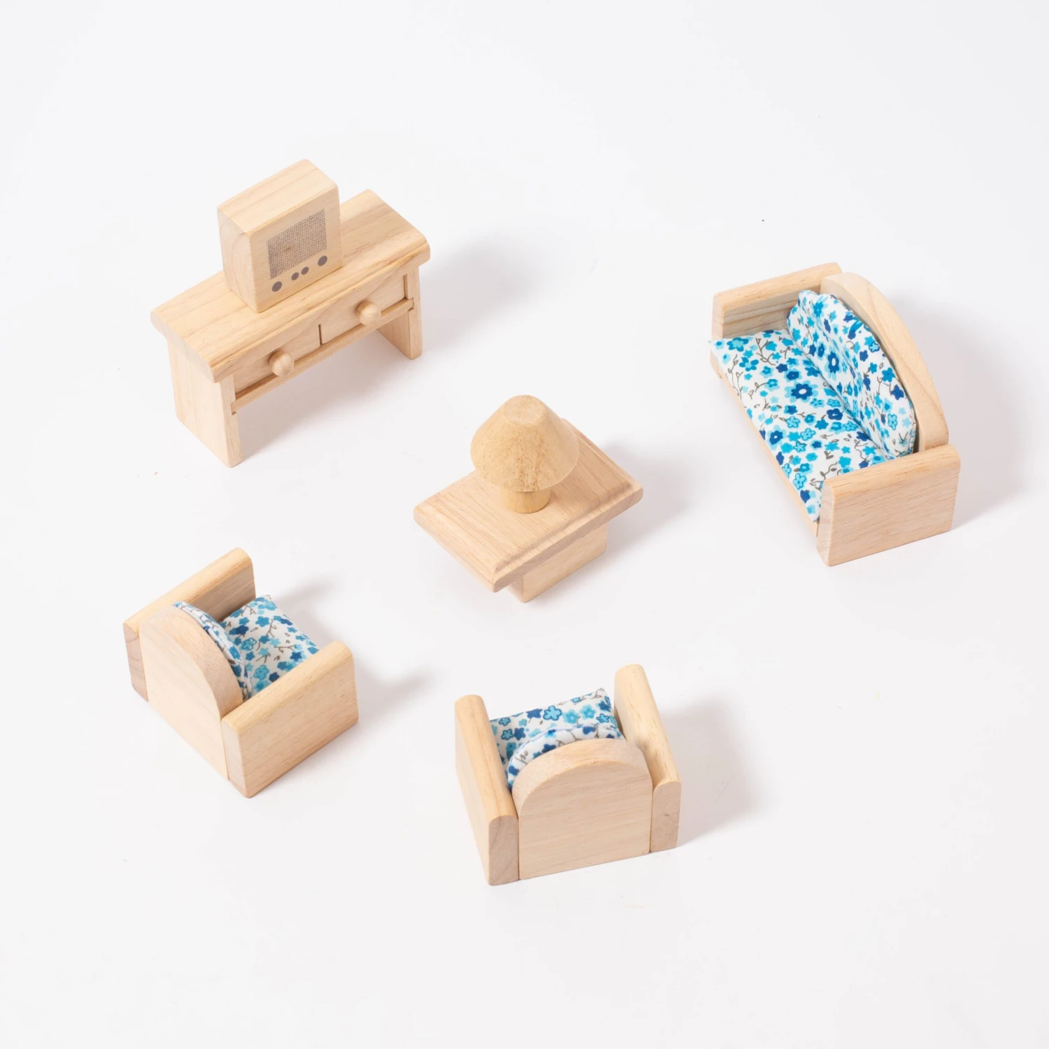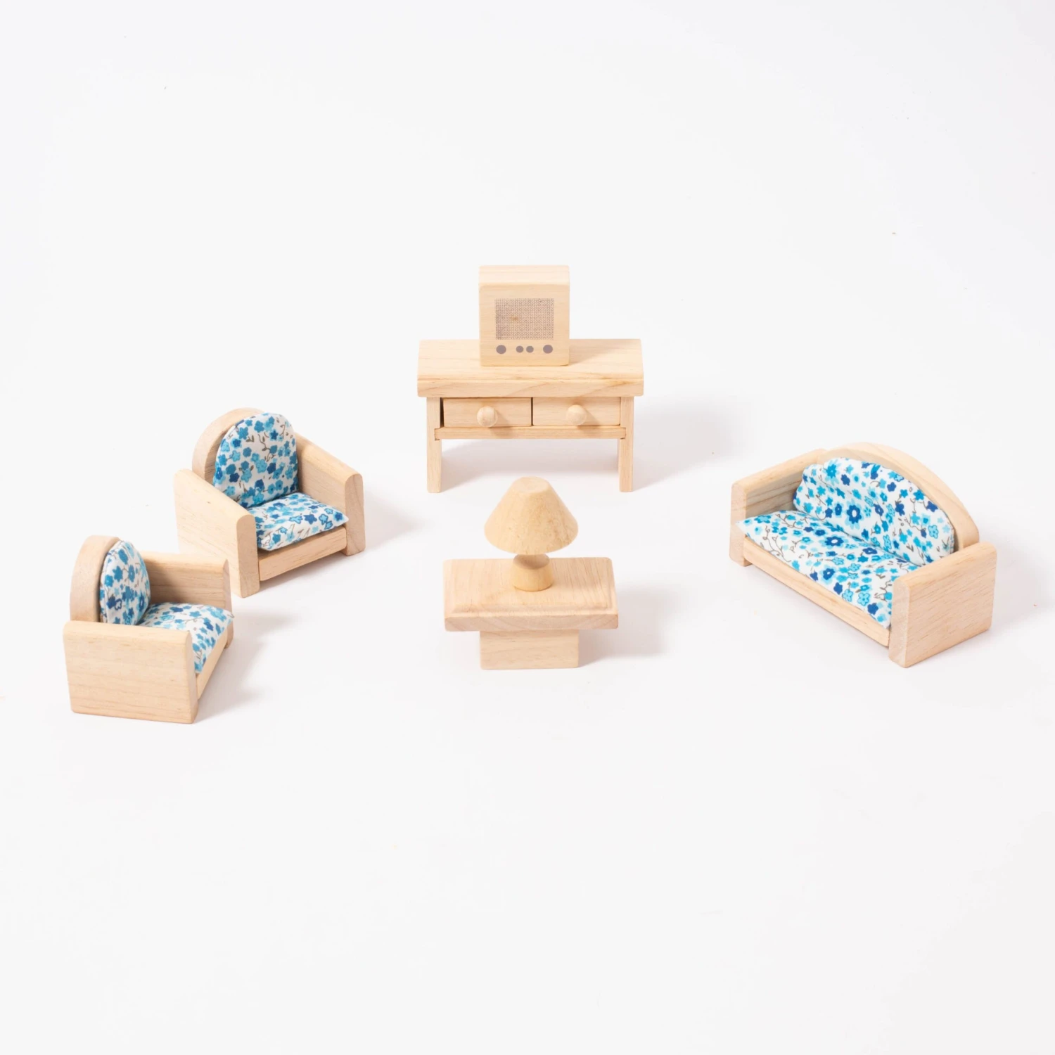 Your dollhouse dolls will love sitting down here for a break. This living room furniture set includes three sofas, a table, a showcase, a television and a lamp, and is compatible with all other PlanToys dollhouses and furniture. Made to 1:2 scale.