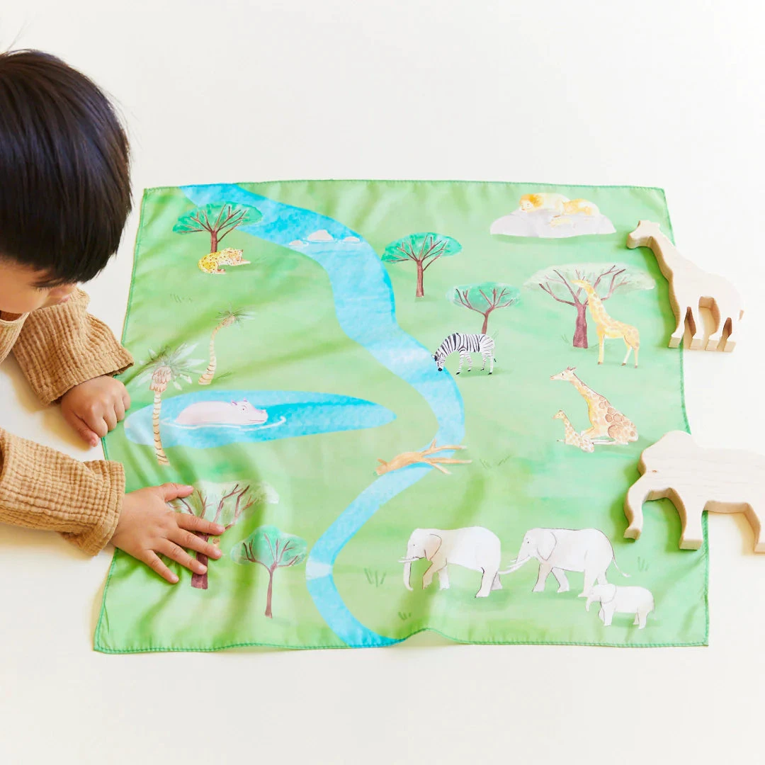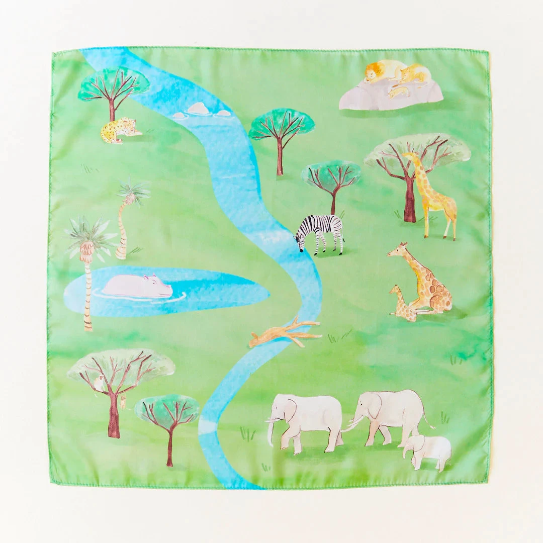 The Sarah’s Silks Safari Playmap is made from gorgeous, heavyweight, 100% pure mulberry silk, and printed with non-toxic, earth-friendly dyes.