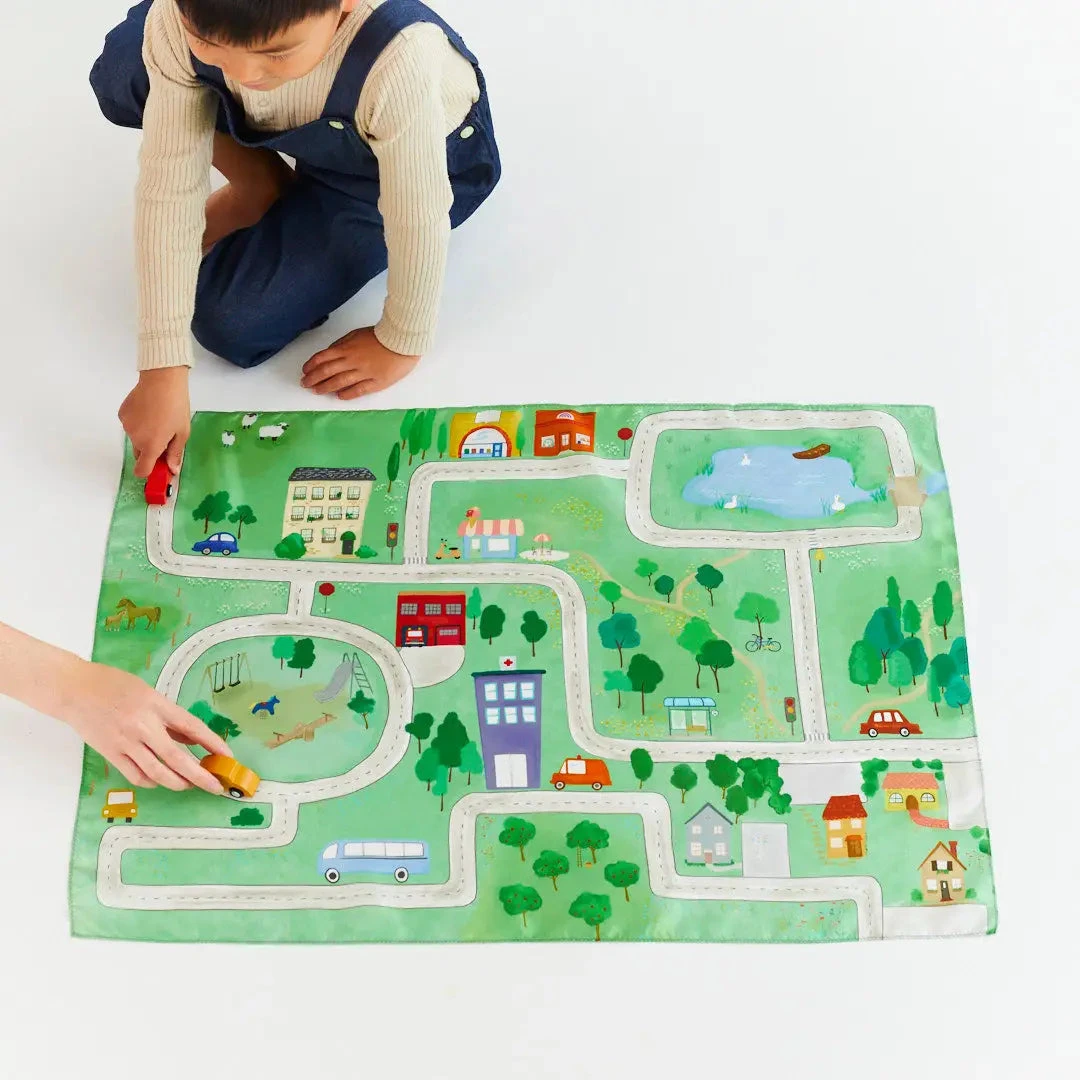 Soft, flowing, and full of adventure, this playsilk is a gentle invitation to explore a charming town, where winding roads lead to all the important places—a school, hospital, fire station, ice cream shop, supermarket, and cosy neighbourhoods. Perfect for little hands and big imaginations, it encourages storytelling, role-play, and endless journeys through a beautifully illustrated world, all with the soothing touch of silk.Â