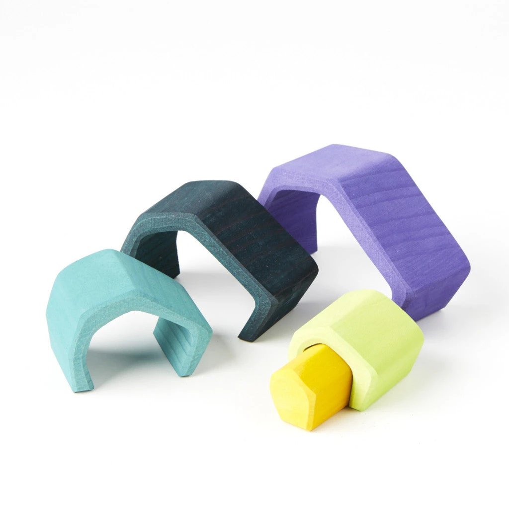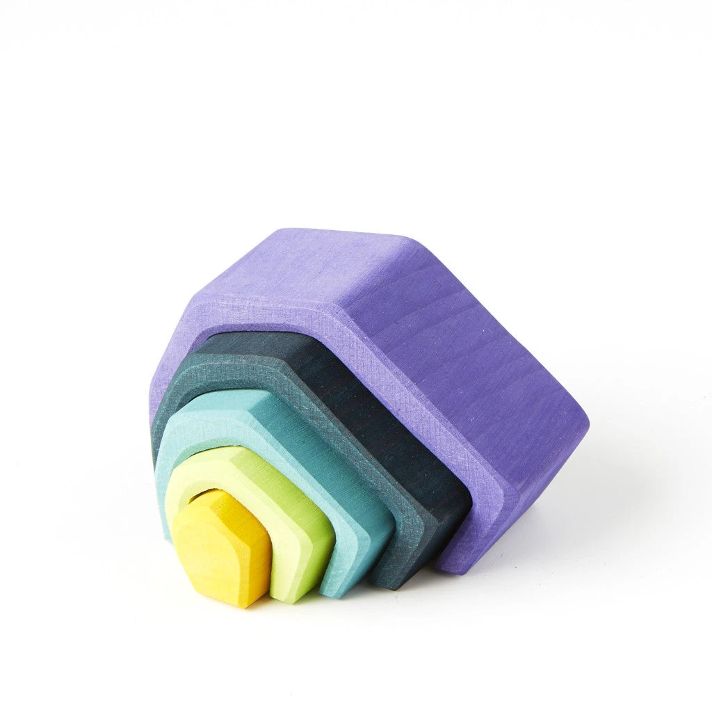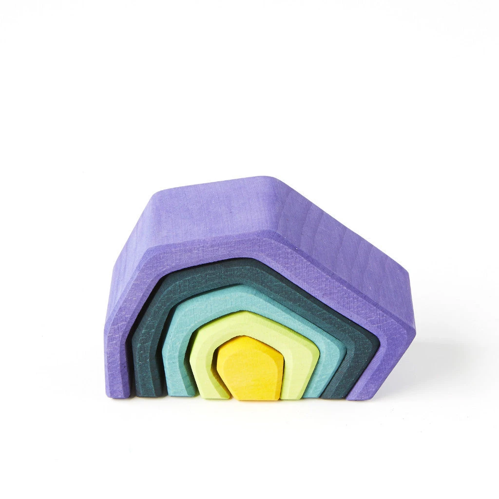 Grimm’s wooden puzzle in shades of yellow, green, turquoise, blue and purple.