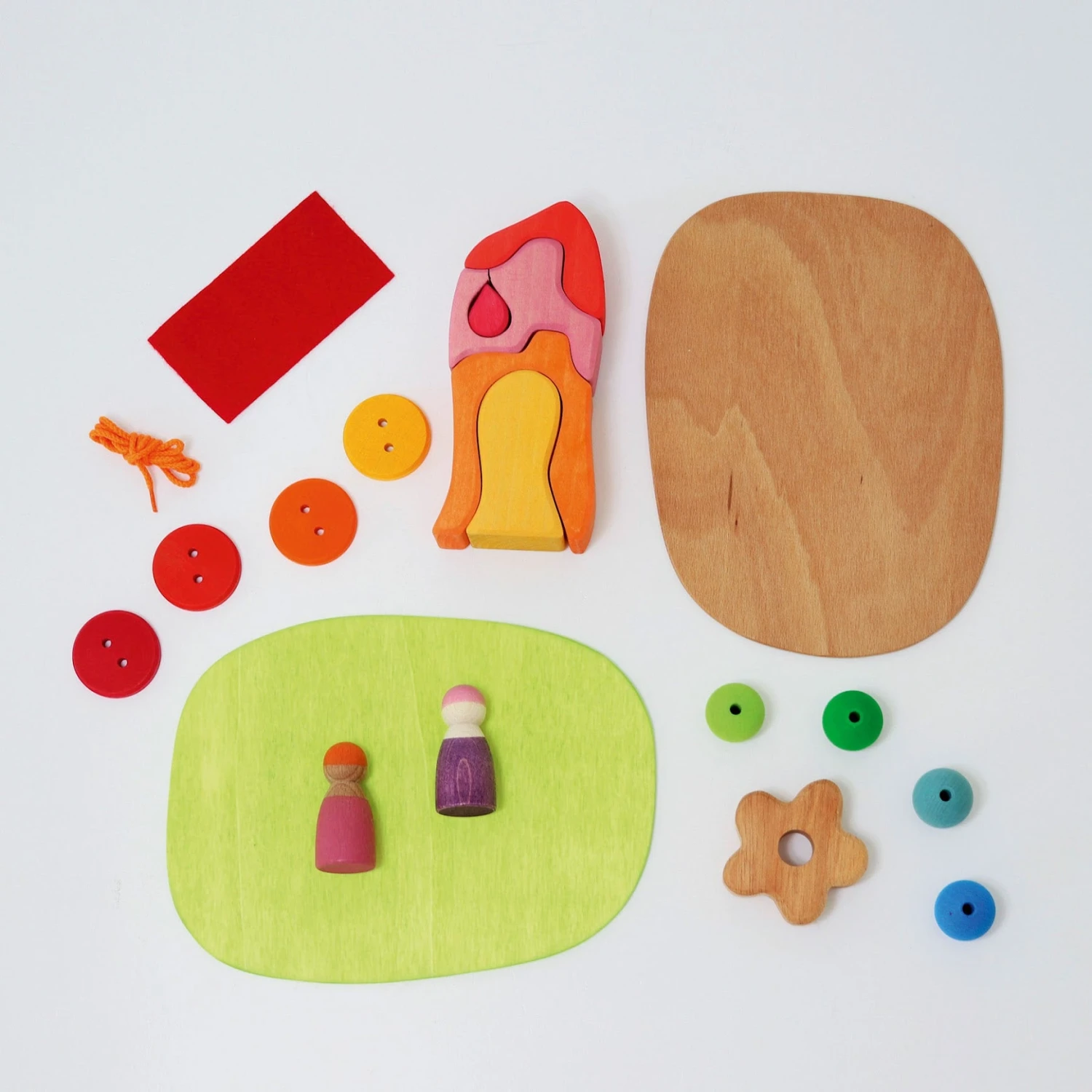 6-piece wooden cottage height 13cm, 2 friends, 4 buttons, 4 beads, 1 flower, 1 bowl, 1 roller, 1 string, 2 play bases, 1 rectangular piece of felt