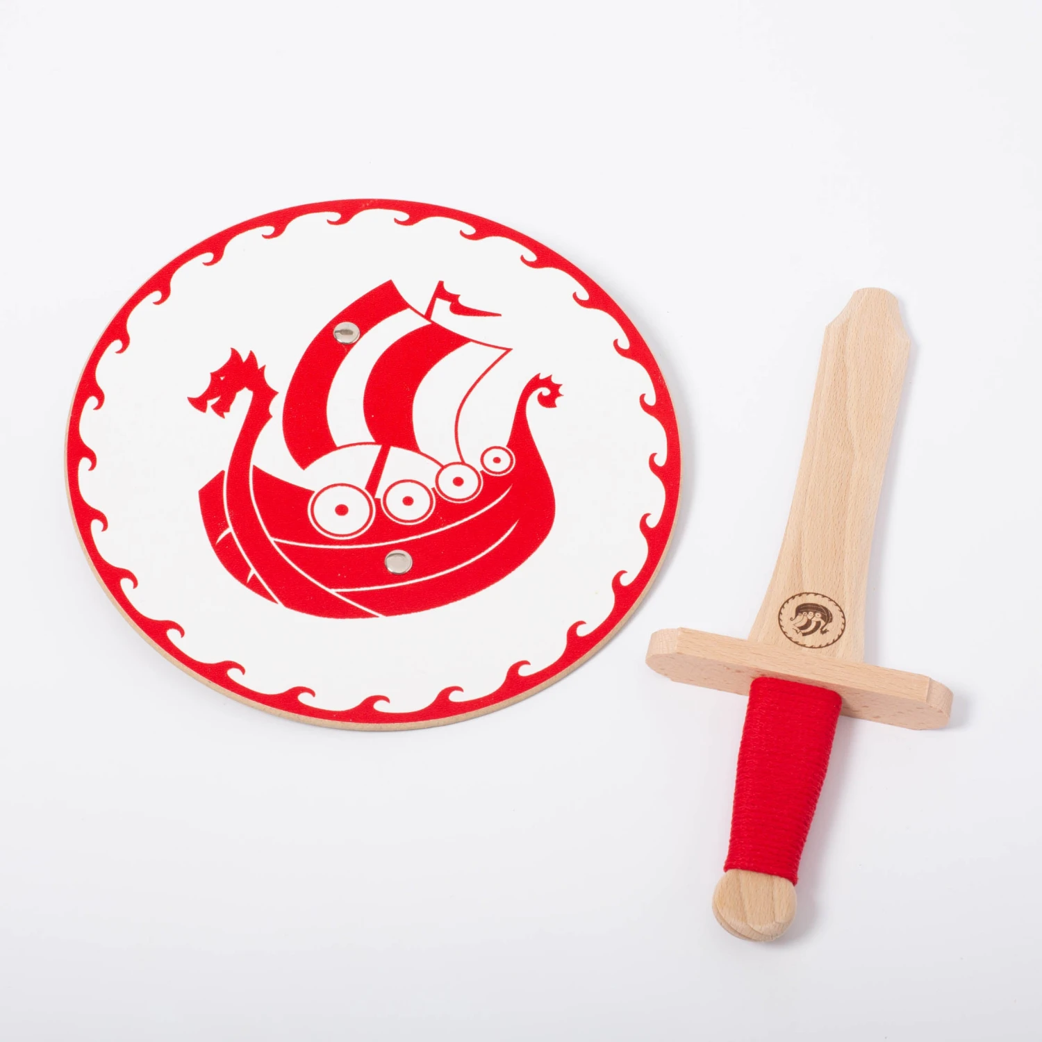Going on a dangerous adventure exploring magical lands, full of fire breathing dragons and mythical beasts? Your little knight will need a trusty shield and sword. This gorgeous handcrafted set by Vah includes a mini round plywood shield, painted with a stunning white and red design and a solid wooden sword with red hilt.