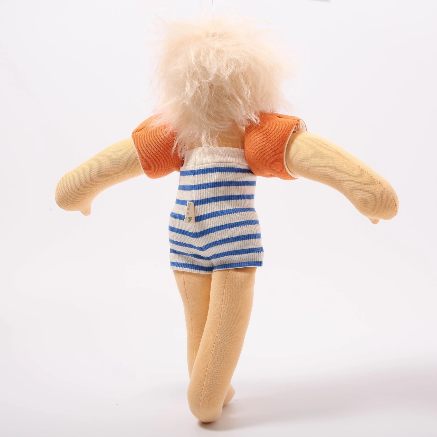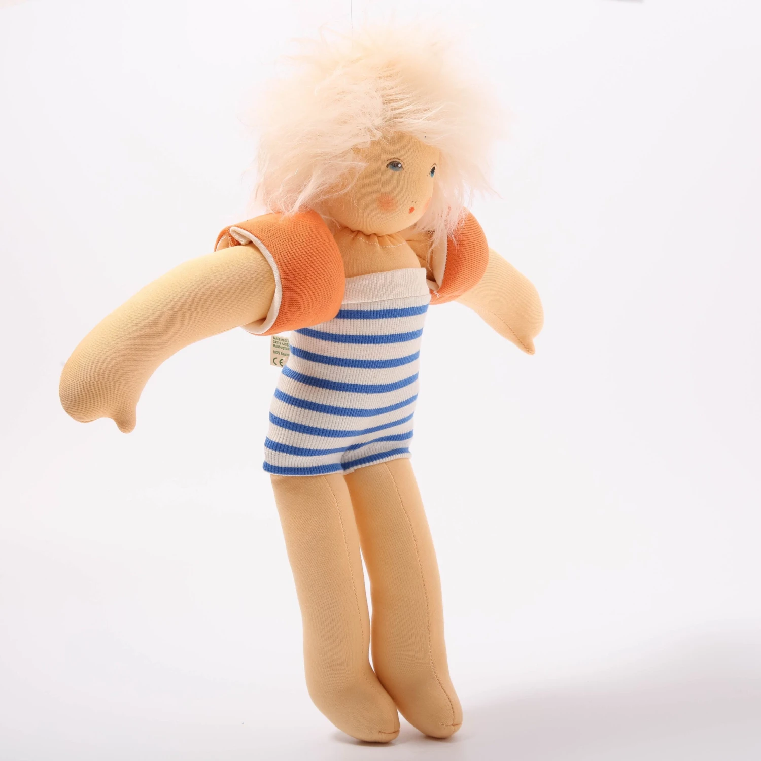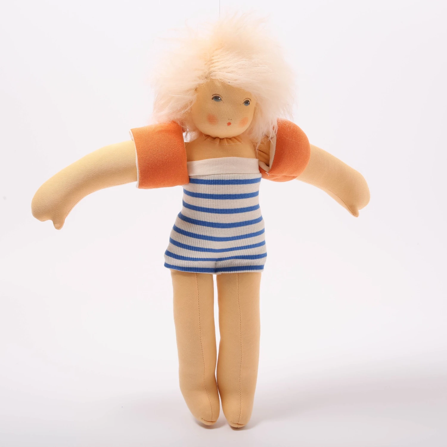 Add to summer fun with this charming organic cotton swimming costume for Nanchen’s Waldorf Dolls! Featuring delightful blue and white stripes and a pair of orange arm bands to make a splash!