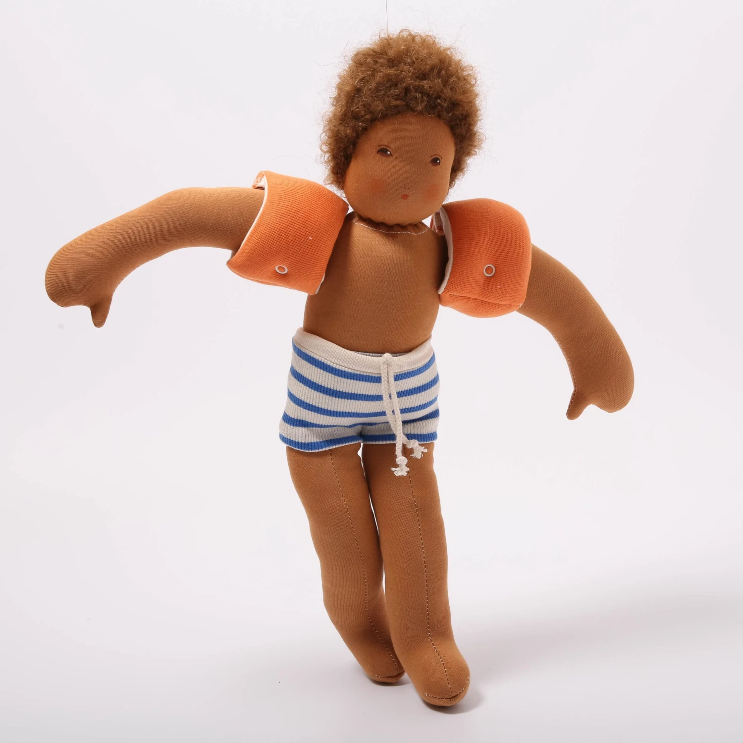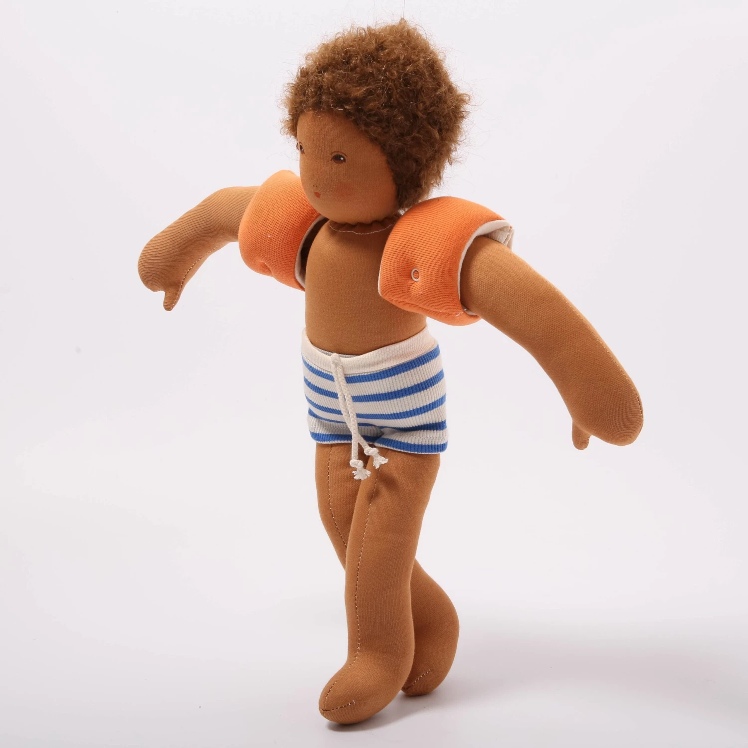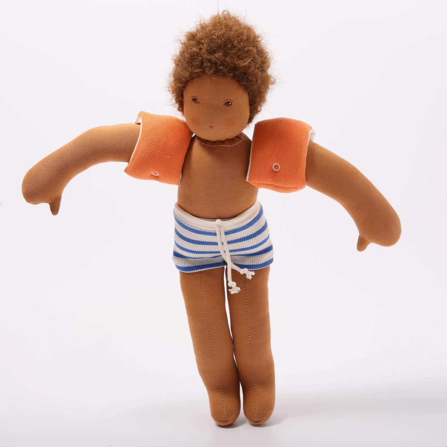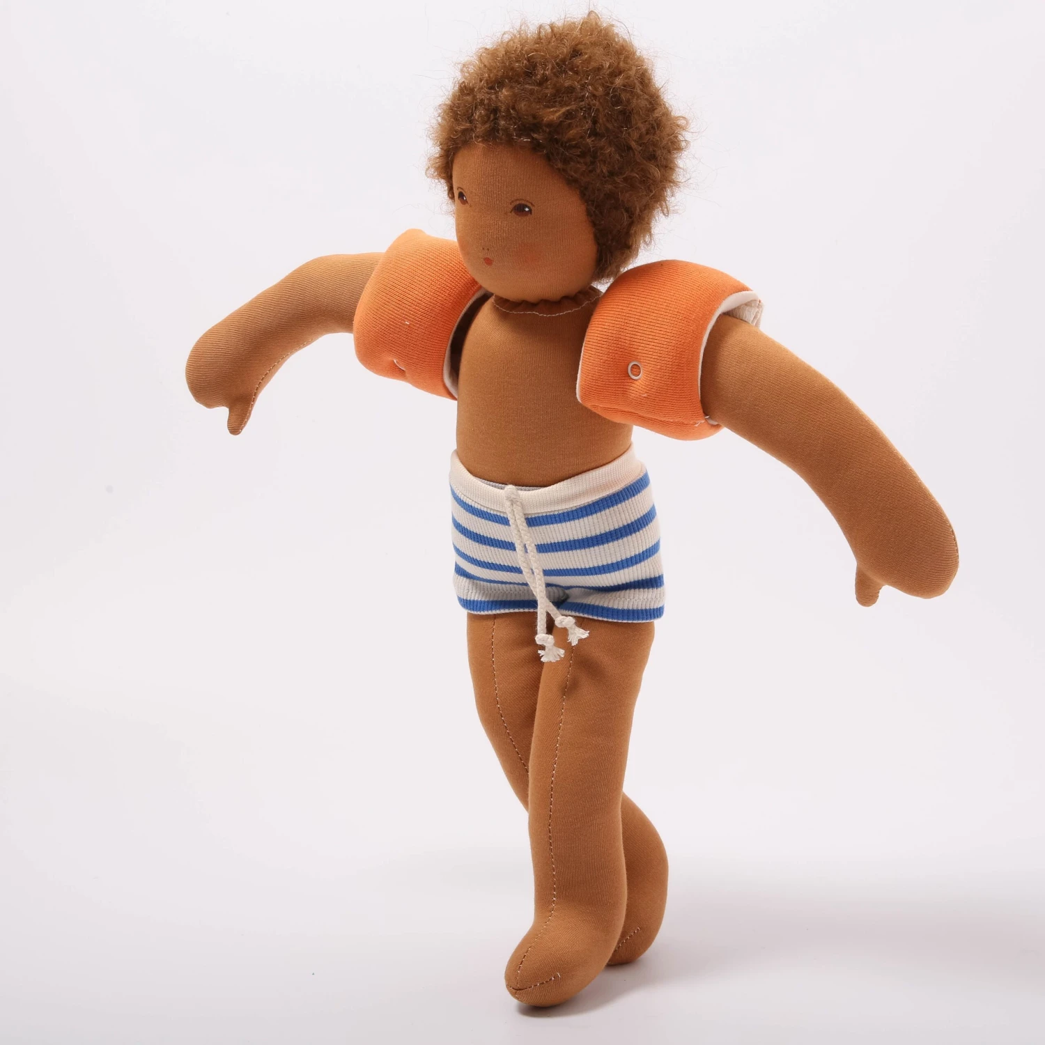 Introducing our fabulously handcrafted Swimming Trunks for your favourite Nanchen Doll. With a playful striped design and two vibrant orange arm bands, these 100% organic trunks are a must-have for your doll’s summer wardrobe. Get ready to make a splash!