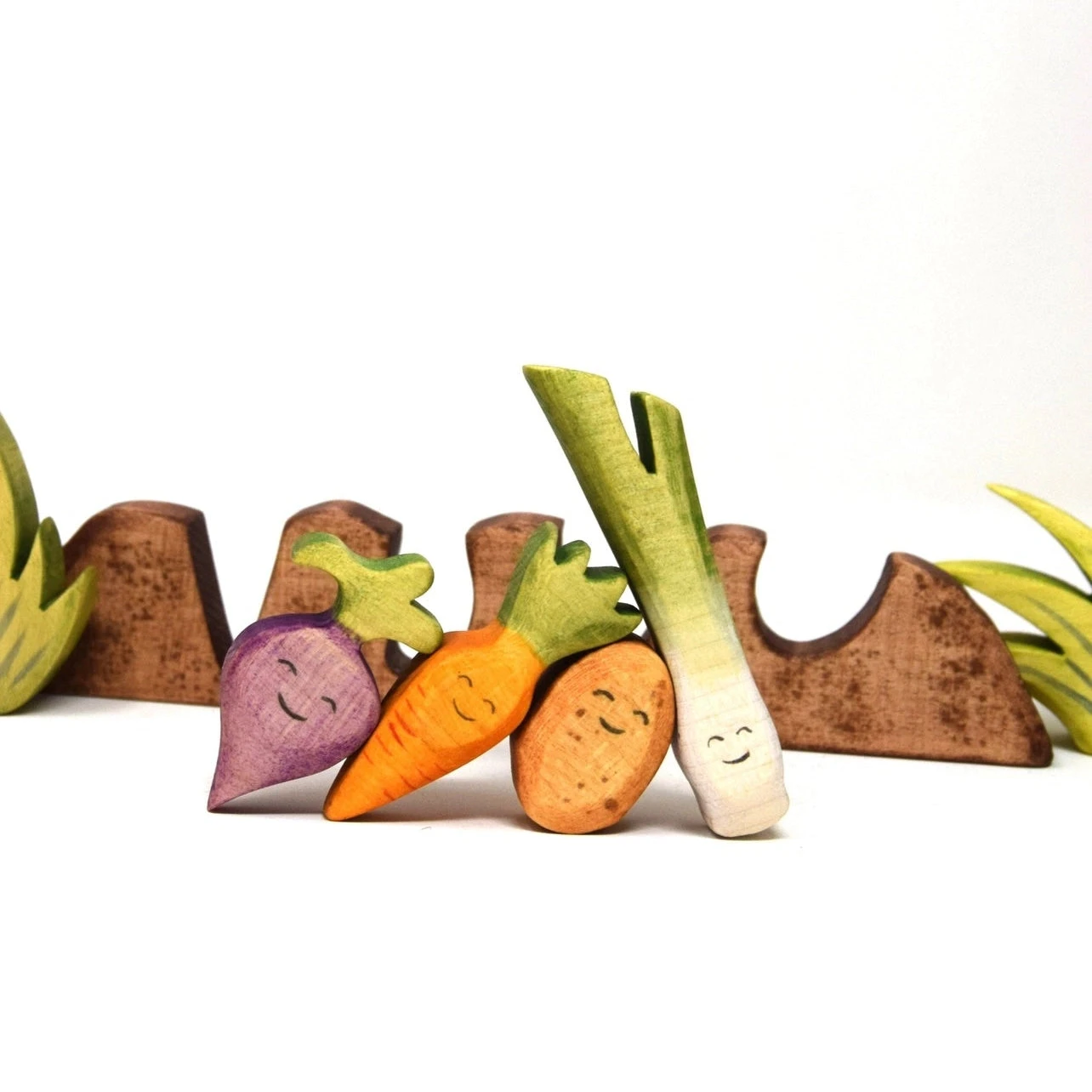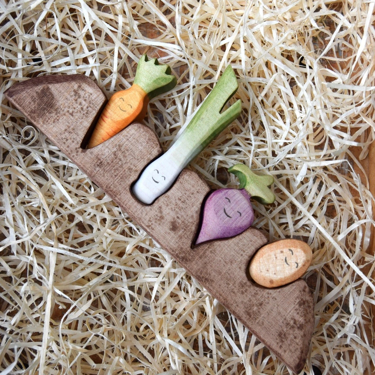 Promoting growing your own and self sufficiency this little vegetable patch is a great addition to a toy collection or summer play scene. The vegetables are interactive in the way they puzzle into the brown earth and can be used independently in play as food or veg in endless opportunities for play. And don’t those cute smiley faces just make you want some happy veg in your life! Hand crafted from sustainable hardwood ( sustainably sourced British Sycamore) this veg patch has a wonderful texture with the wood grain showing through the natural plant based stains.