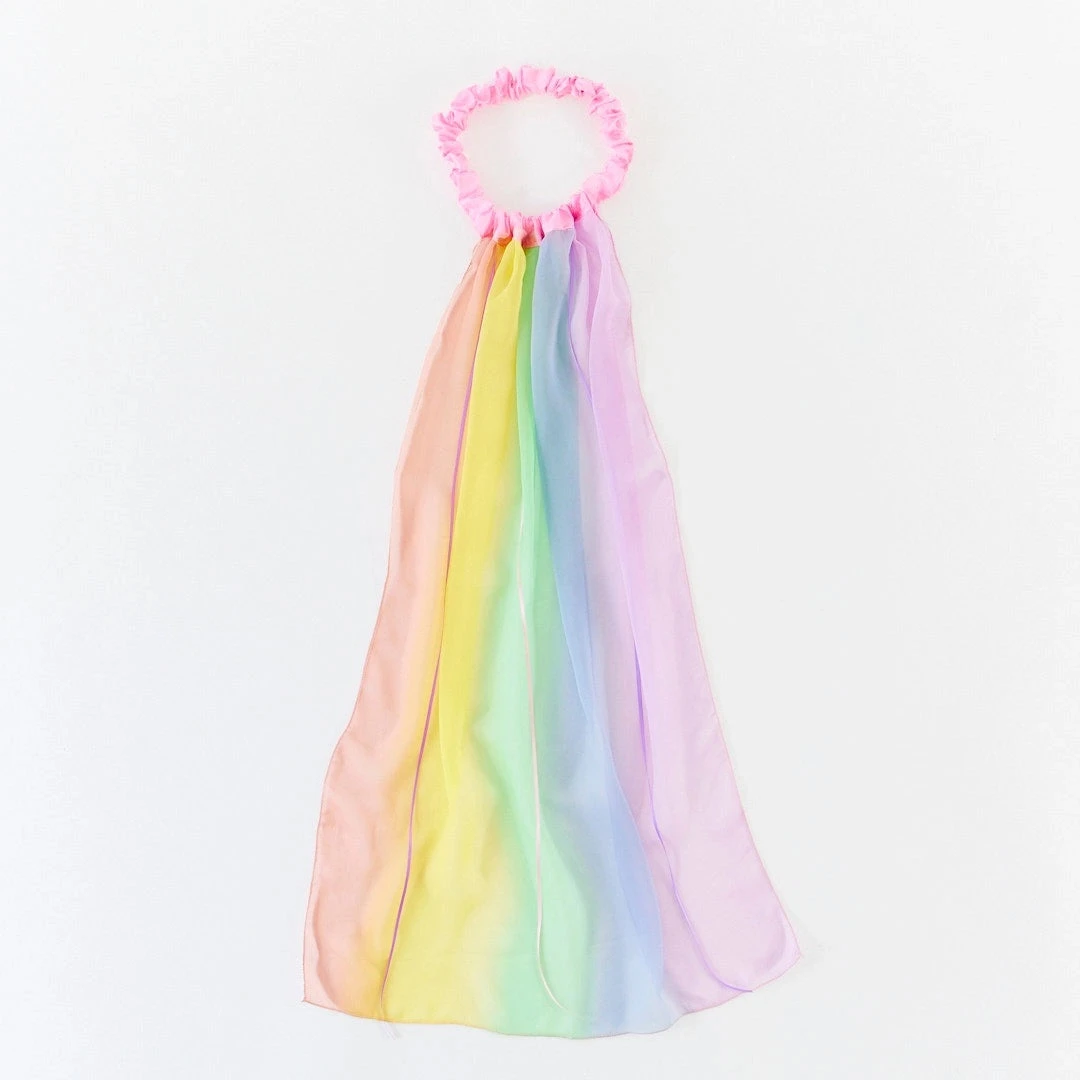 Soft Georgette Silk, flowing from a silk garland with coordinating ribbons. Perfect for imaginative play, these fluid veils transform little ones into princesses, soaring birds, mystical genies, playful ghosts, and so much more!
