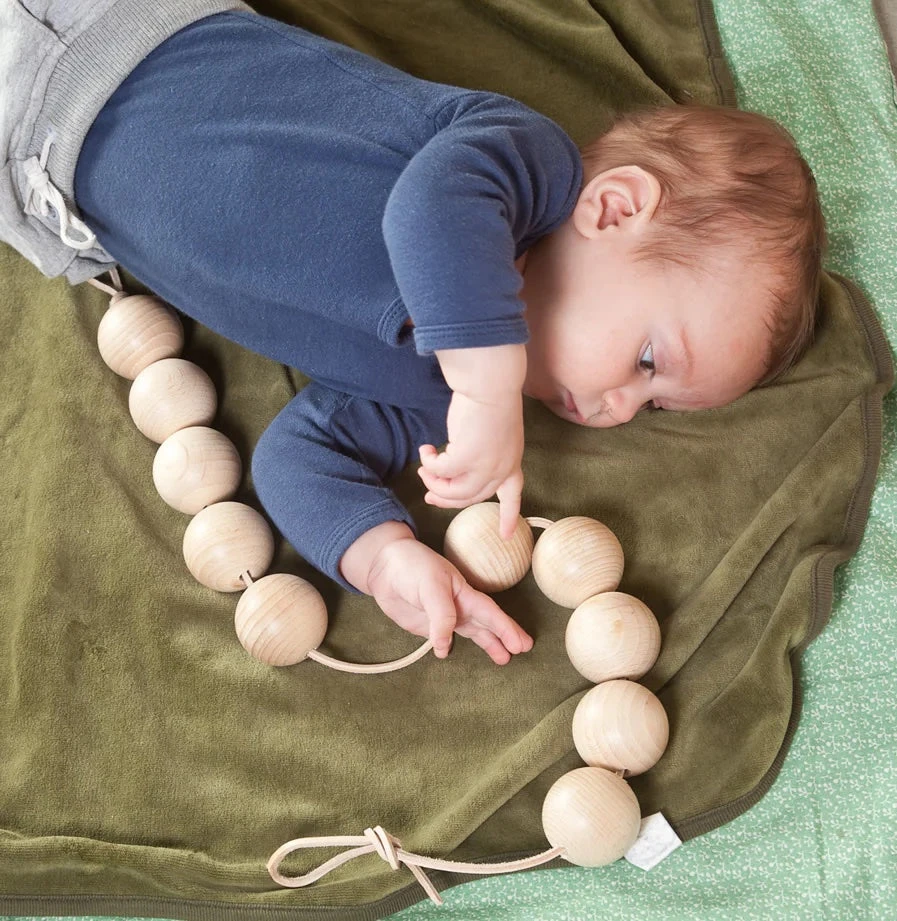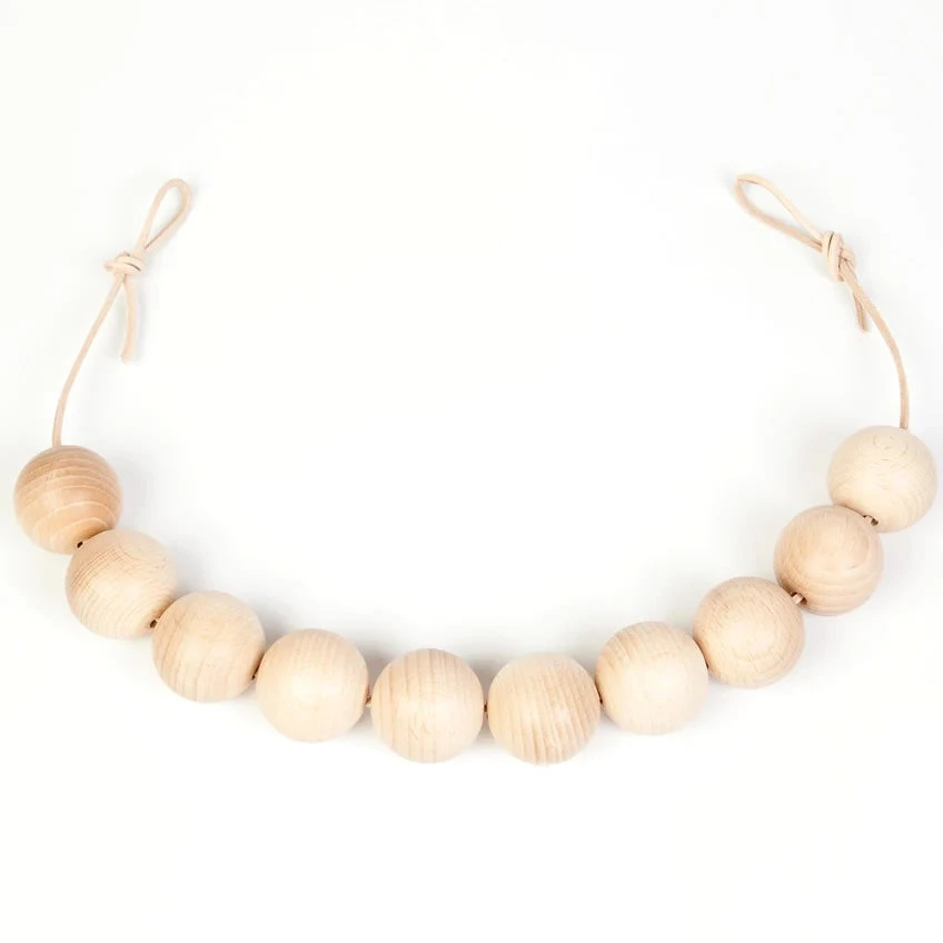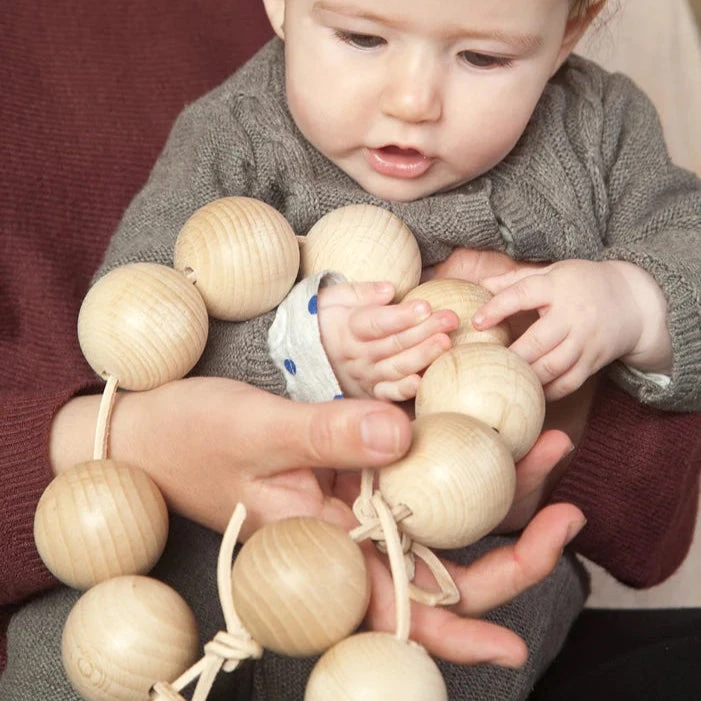 Touch, feel and enjoy this garland of large wooden balls. 10 natural wooden balls on a rope act as a sensory toy for babies that can be hung from a play gym or pram or simply held and played with. Small hands reach out to touch the balls and they move and interact with each other in unusual ways. The relationship between the balls movements help to develop spacial awareness and early months motor skills. The wood is beautifully tactile to the touch and great for little people to grasp and explore. The balls can later be used in all kinds of games and integrated into marble runs and block sets.